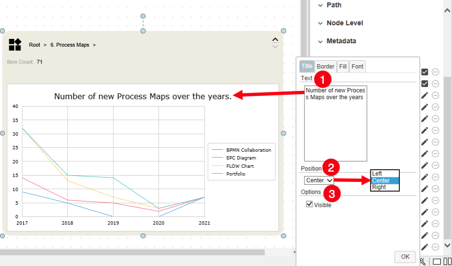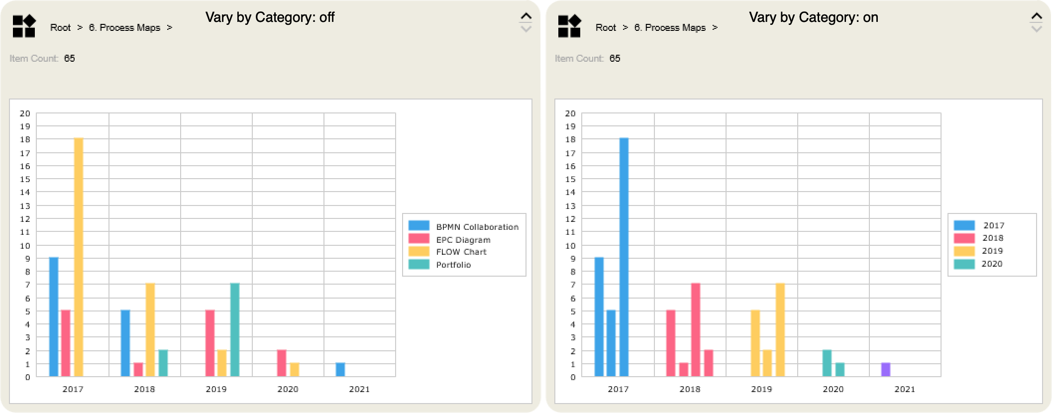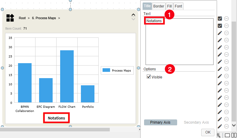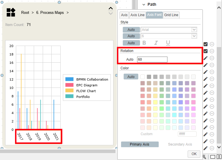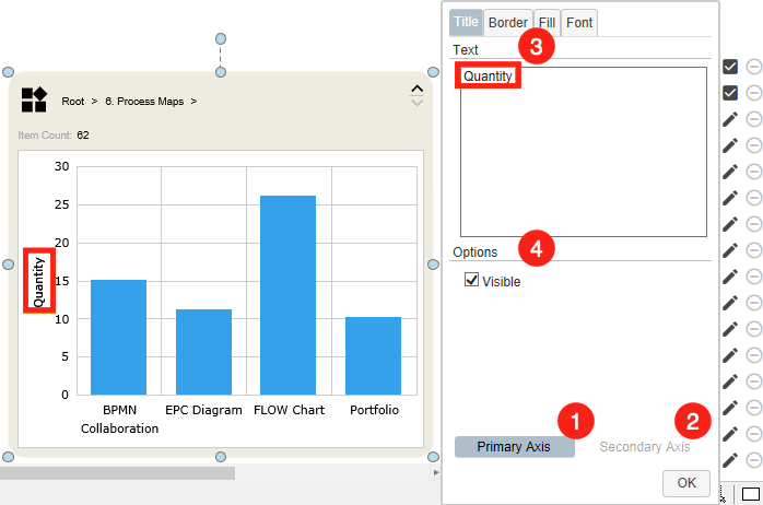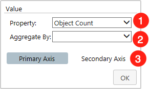 This section is about the configuration of the vertical axes. By default, the number of elements (Item Count) is mapped here. If you have created a secondary Value Axis (see the Data Series section at the end of this article to learn how this works), you can specify here whether the changes should apply to the primary or secondary axis.