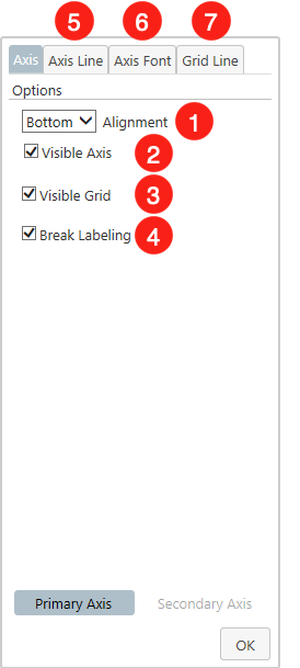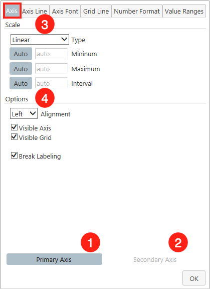 1. Primary Axis - The Primary Axis is located to the left of the Plot Area. When this button is selected, subsequent changes will apply to it. By default, the Primary Axis is selected.