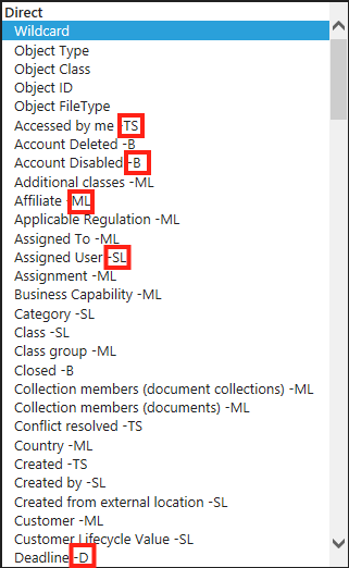 - ML = Multiselect List - If one or more values of a property can be selected from a predefined list, they are covered here.