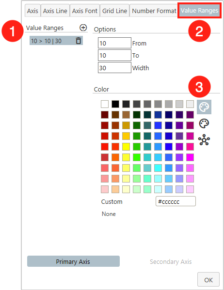 Value Ranges - In this tab, you can color certain value areas of a chart. This can be useful, for example, to highlight sustainable growth in a line chart, or to color customer satisfaction in a gauge pointer chart.