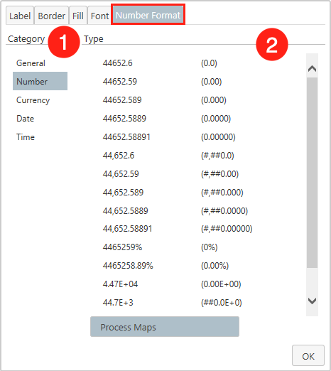 General,Number(This includes decimal points and percentages),Currency,DateandTimeformat. - Type - Depending on the previously selected number category, you can choose here the exact representation of the Series Label.