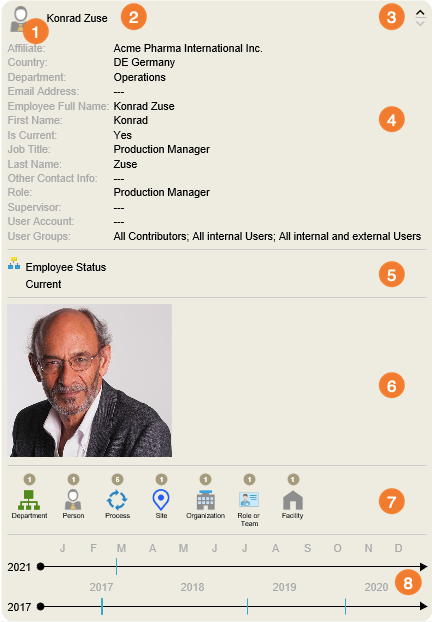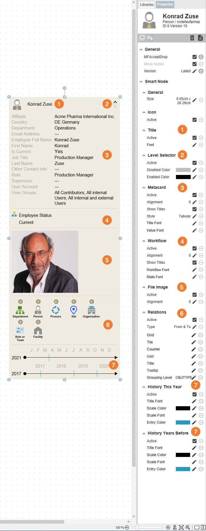 - The Metadata Smart Node contains various information about the linked object. In example, the user gets an overview of the most important metadata of his colleague, Ann Clarke. He knows directly in which workflows and processes she is involved. In addition, the timelines make it possible to logically trace when changes were made to her profile.