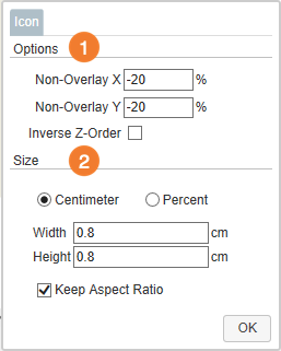2. Size - set the size for all of the icons. If you deselect Keep Aspect Ratio, you can determine Width and Height independently from one another. You also have the choice between determining the size in centimeters or change it in percentages.